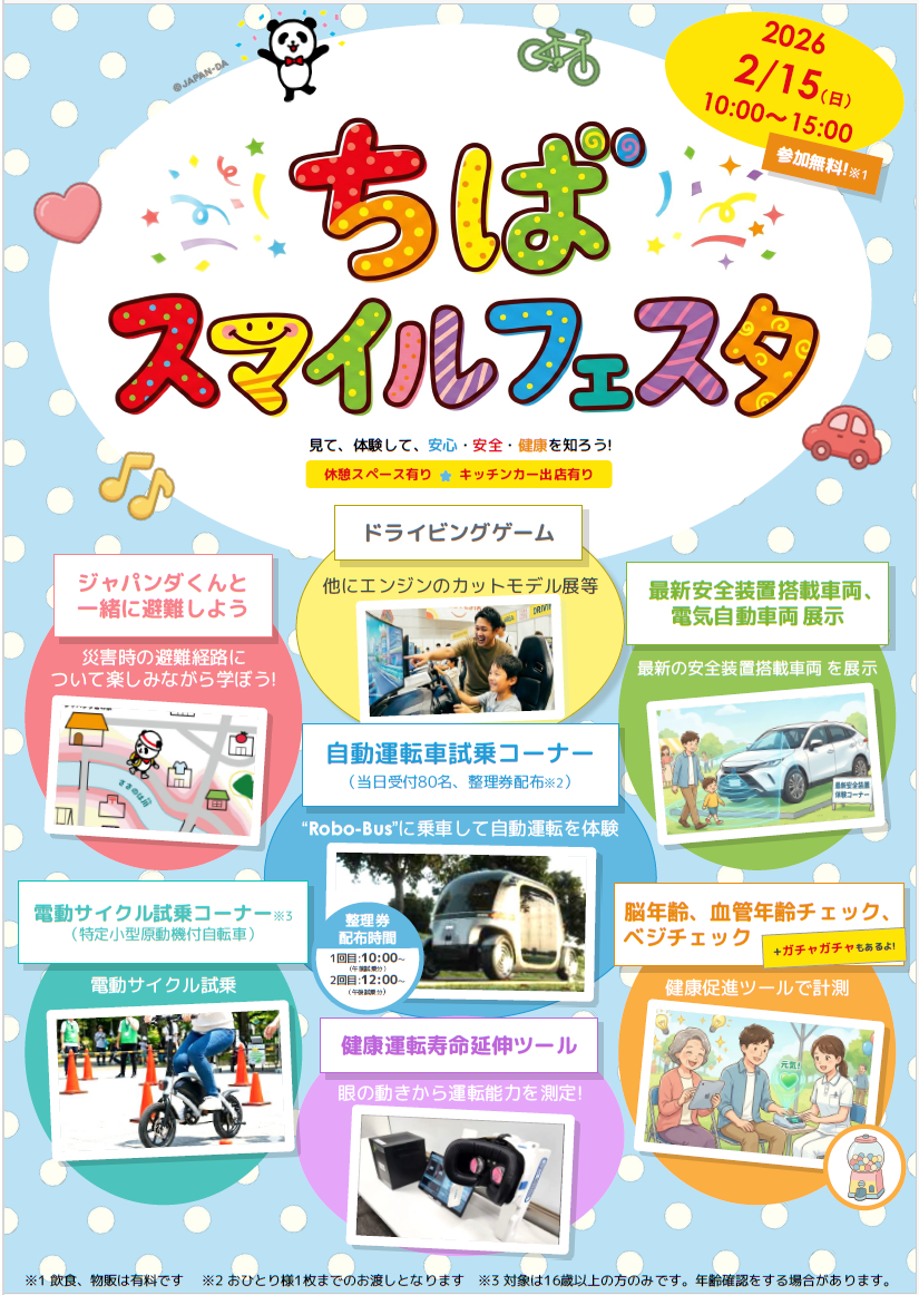 2026年2月15日に損保ジャパン主催の 見て、体験して「安心」「安全」「健康」について学べるイベント 「ちばスマイルフェスタ」が開催されます。 《参加費》 無料(※飲食、物販は有料です) 《開催コンテンツ》 福祉車両乗車体験、RIZAPの健康体操、警察音楽隊の演奏、パトカー・白バイ体験など 《会場